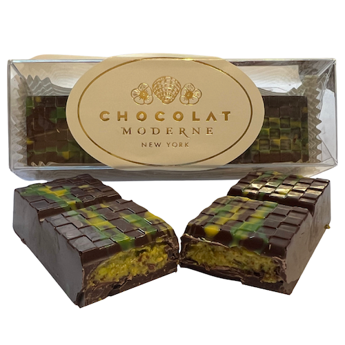 Dark chocolate (cocoa beans, sugar, cocoa butter, sunflower lecithin, natural vanilla extract), pistachios, white chocolate (sugar, cocoa butter, milk powder, sunflower lecithin, natural vanilla extract), kataifi shredded phyllo dough (wheat flour, water, wheat starch, salt. soya lecithin, sunflower oil, potassium sorbate), tahini {sesame paste), confectioner's sugar (cane sugar, corn). fractionated coconut MCT oil, salt. Decoration: cocoa butter and natural color. May contain other tree nuts an/or peanuts.